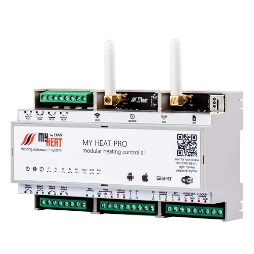 Контроллер MY HEAT PRO предназначен для управления сложными системами отопления и горячего водоснабжения в частных домовладениях и небольших предприятиях. Осуществляет управление каскадом отопительных приборов, бойлером косвенного нагрева, насосами, смесительными узлами, 3-х и 2-х ходовыми клапанами, предоставляет возможность регулировать температурный режим до 80 сред отопления включительно. Обеспечивает удаленный контроль всех параметров системы отопления, а также SMS и Push оповещение, в случае возникновения ошибок.