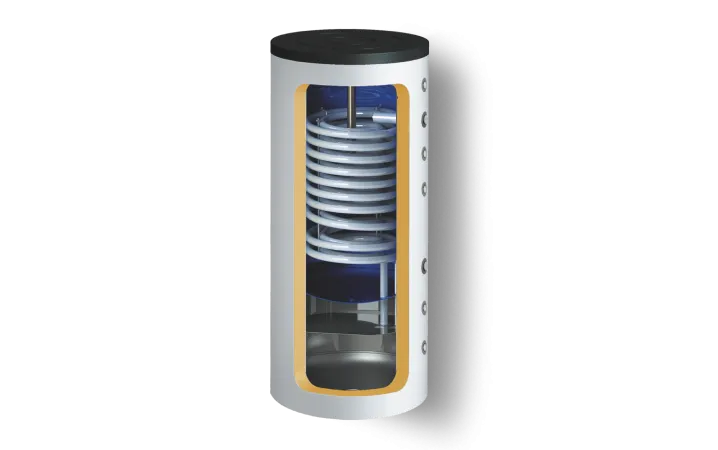 Большая поверхность змеевика — идеальный для совместной работы с тепловым насосом.