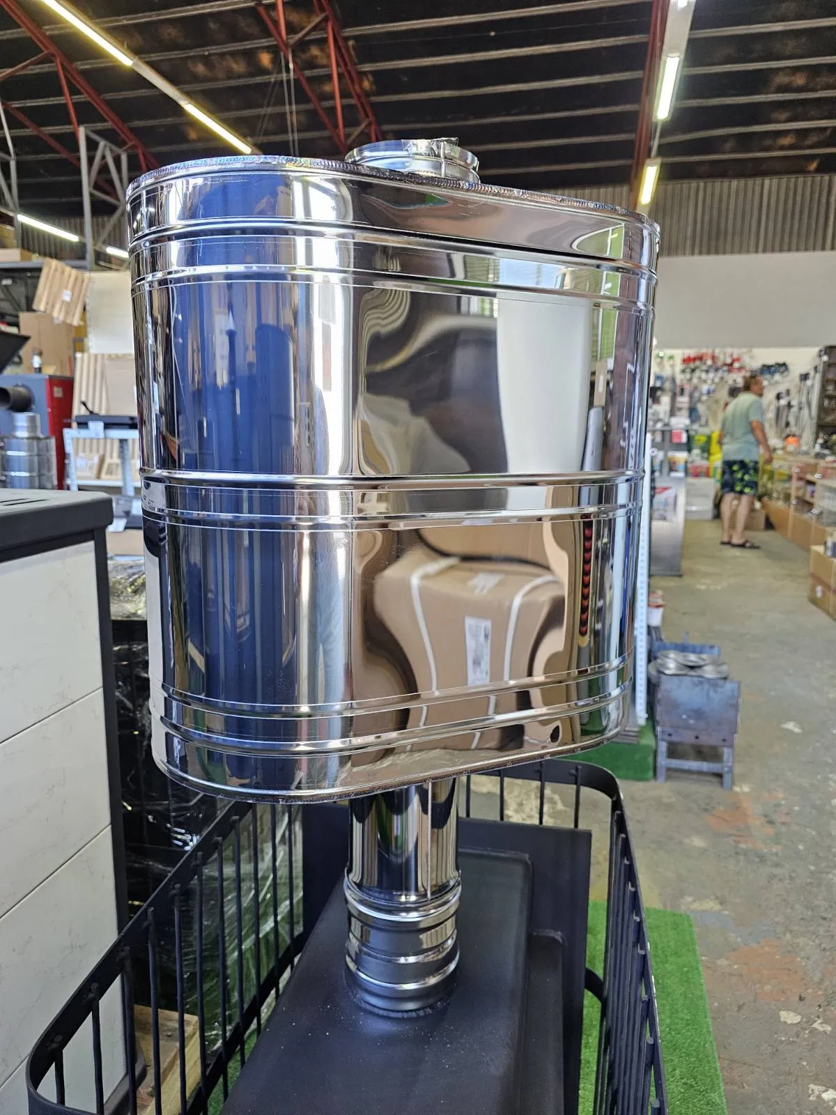 Бак 70л овальный на трубе - это емкость из матовой нержавеющей стали через которую проходит труба дымохода толщиной 0.8 мм. Устанавливается у основания дымохода в качестве первого его элемента. Вода нагревается за счет разогрева проходящей через него трубы.