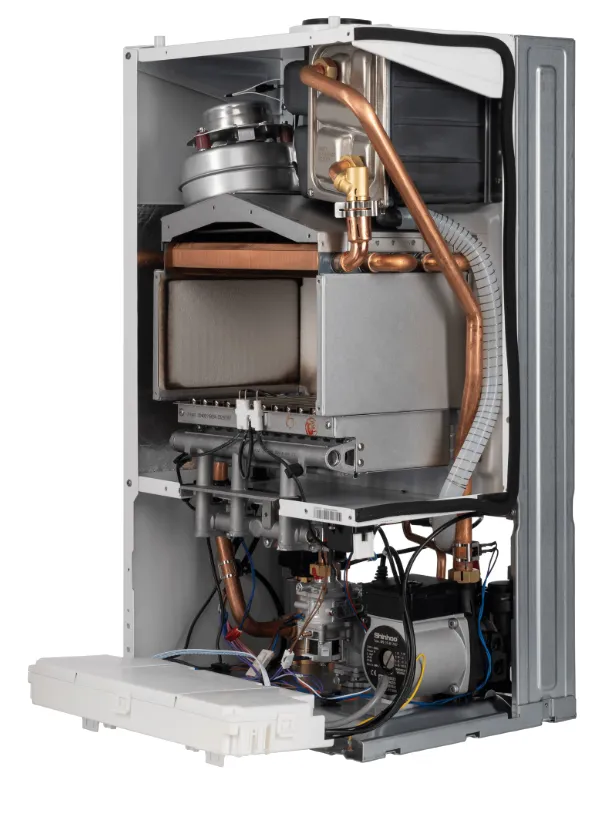 Ключевой элемент котла - это высокоэффективный теплообменник, изготовленный из чистой меди по технологии "Oxygen-Free", что обеспечивает его надежность. Конструкция также включает конденсационный экономайзер для увеличения тепловой эффективности и модулируемую горелку, поддерживающую широкий диапазон мощностей. Надежность и долговечность котла дополнительно гарантируются благодаря гидравлическому блоку, выполненному из качественной латуни.