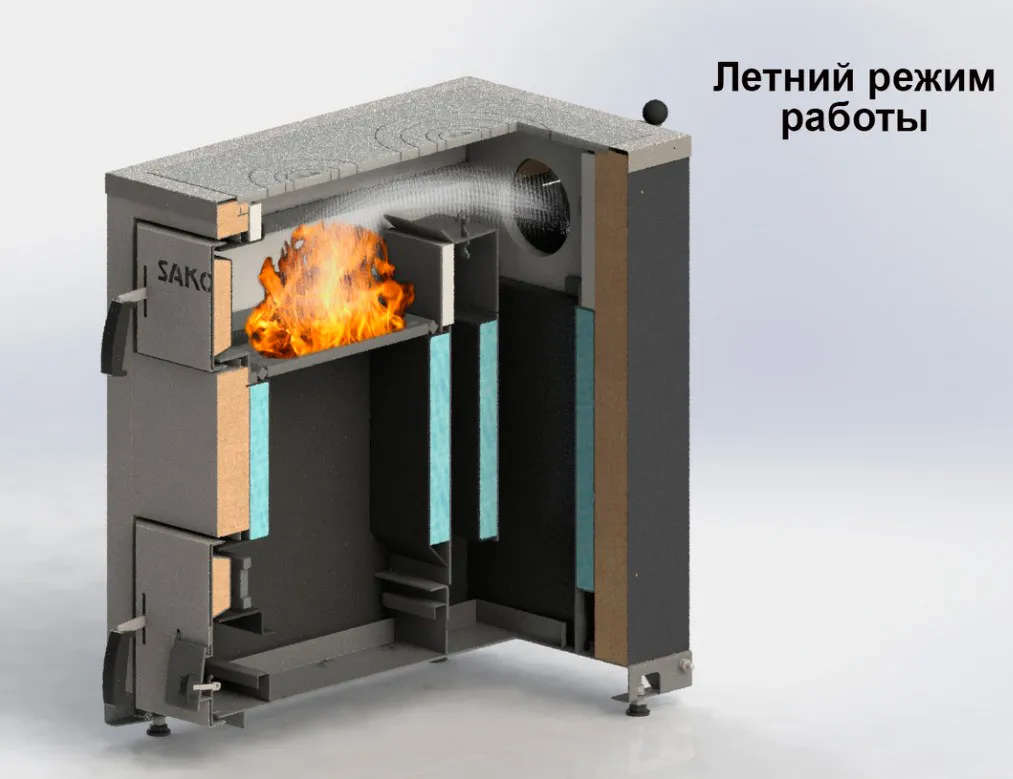 Режим "ЛЕТО": При использовании этого режима колосниковая решетка перемещается в верхнее положение. Главная цель – подогрев чугунной варочной поверхности. Важно отметить, что в режиме "ЛЕТО" нагрев воды в теплообменнике не происходит.