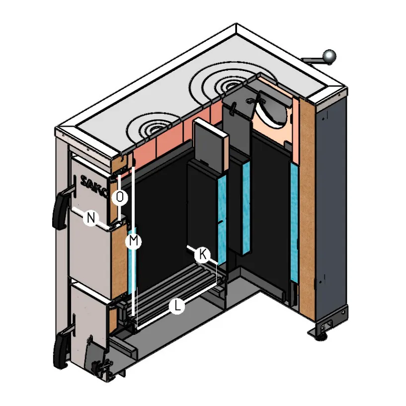 Камера, предназначенная для приготовления пищи, облицована жаростойким шамотным кирпичом. Такая конструкция обеспечивает защиту котла от высоких температур и перегрева, а также способствует накоплению и равномерному распределению тепла, создавая условия для приготовления пищи, аналогичные традиционной печи.